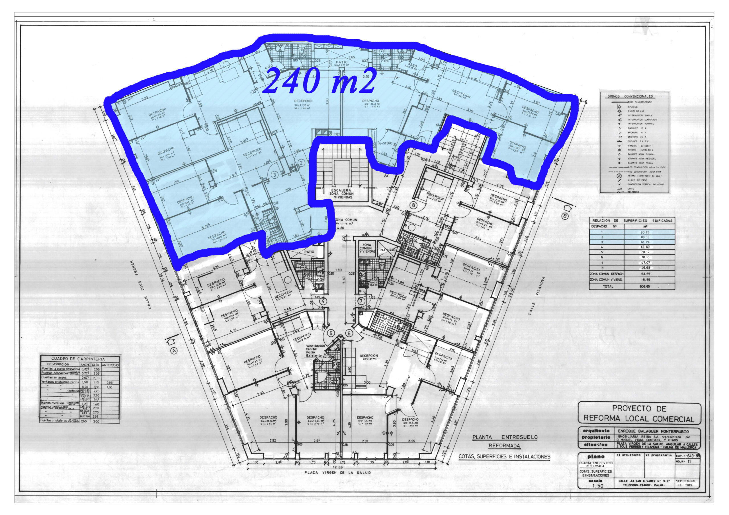 Ubicados en la Calle Vilanova 1a, zona muy céntrica cerca del Mercado del Olivar y la Calle San Miguel en Palma de Mallorca, una ubicación inmejorable. Todos los despachos tienen aire acondicionado, grandes ventanales y mucha luz natural. Están en una primera planta sin ascensor, con acceso fácil. Gran recibidor, antigua oficina utilizada como notaría. Llame ahora para concertar una cita sin compromiso. Abstenerse intermediarios y agencias… sólo clientes directos.